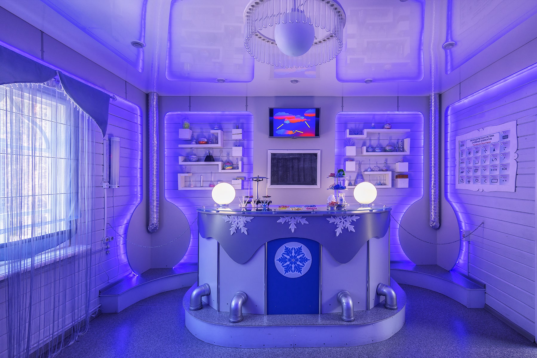 Путешествие по Терему Деда Мороза и встреча с Зимним Волшебником. Именно здесь происходит главное таинство Новогоднего праздника – общение с Дедом Морозом. В Тереме Деда Мороза, помимо Тронного зала, есть еще немало волшебных комнат, посетив которые, вы узнаете, как живется в них Деду Морозу: где он спит (спальня с резной кроватью и пуховыми перинами), в какие одежды одевается (гардеробная с удивительными сказочными нарядами), где работает (рабочий кабинет с библиотекой и обсерваторией), где хранится коллекция подарков, которые привозят Деду Морозу со всего света.